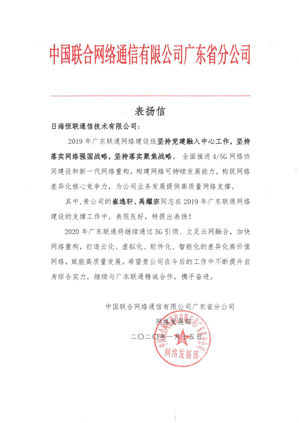 轉(zhuǎn)發(fā)“中國(guó)聯(lián)合網(wǎng)絡(luò)通信有限公司廣東省分公司網(wǎng)絡(luò)發(fā)展部”對(duì)我公司員工的一封表?yè)P(yáng)信